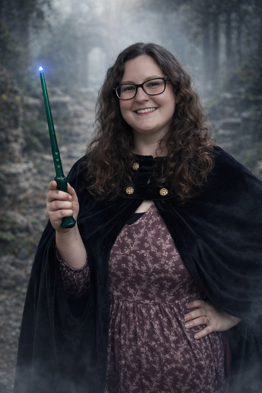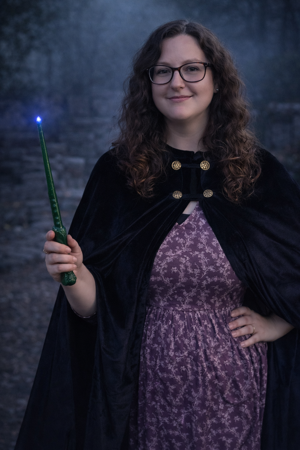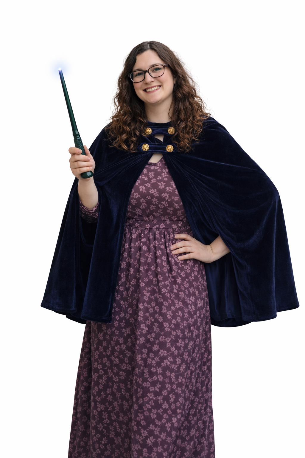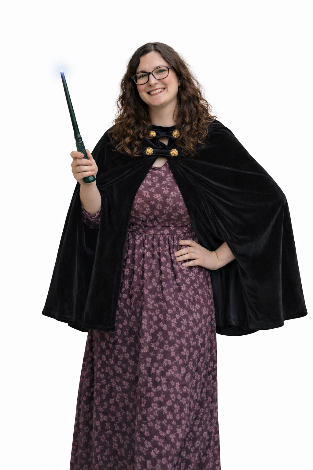 Plus Size (XL-3X): The cape measures 58″ around the chest, but please remember that this measurement must include your arms alongside your chest. The full shoulder width is 23″ shoulder to shoulder across the back. Neck opening is 10.5” (non-stretched; just like you see it in the photos). The cape measures appx. 38″ long from the center back neck to the bottom of the cape, and 148″ around the circumference of the bottom hem (that’s more than 12 feet!). The vertical arm slit is 8.5”.