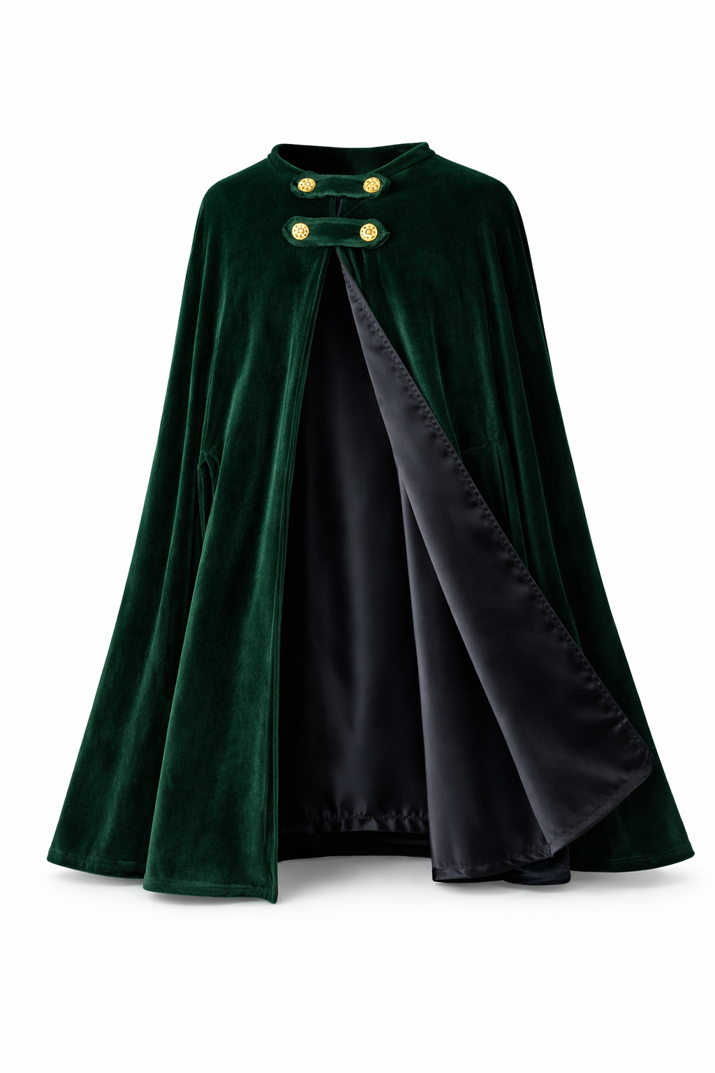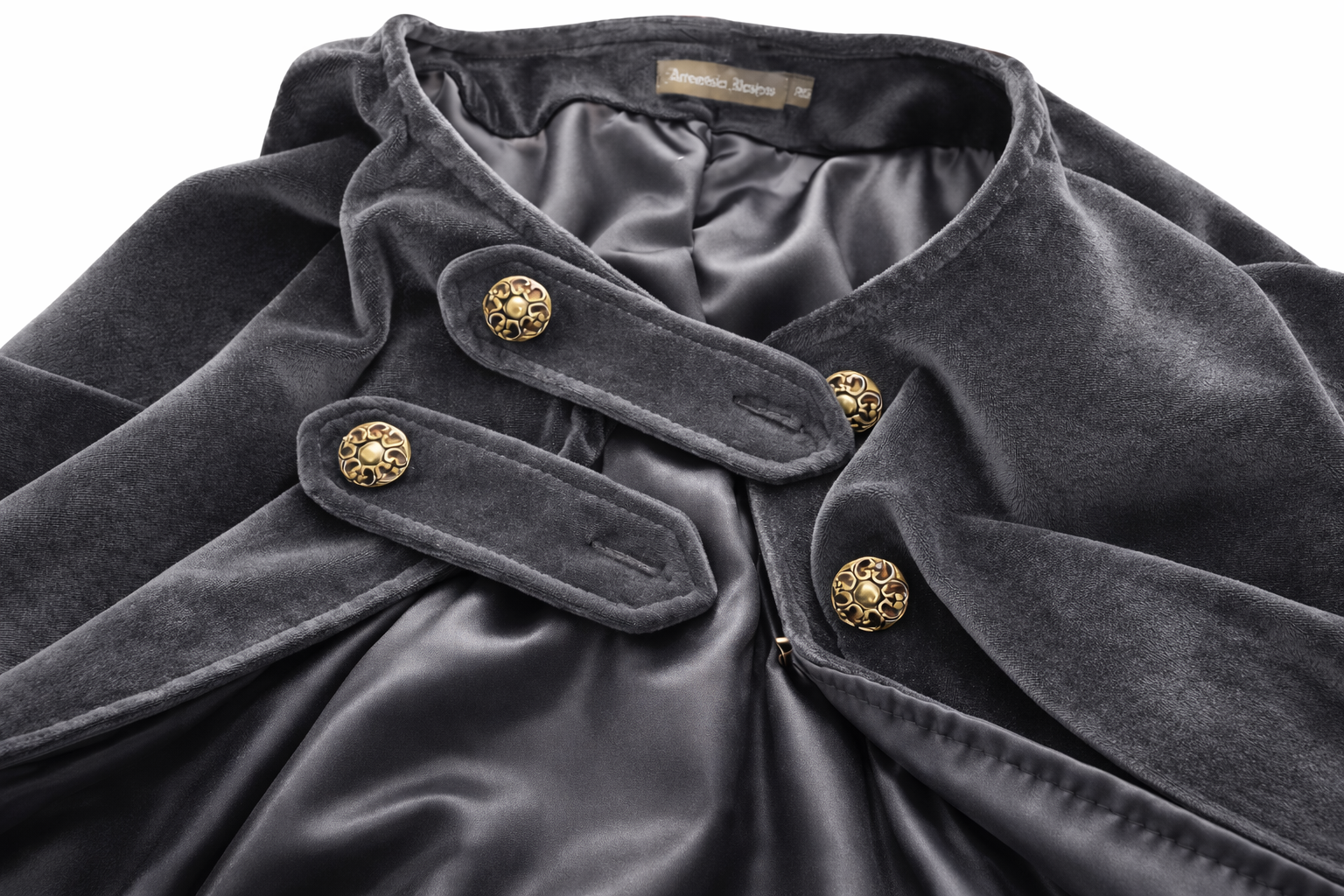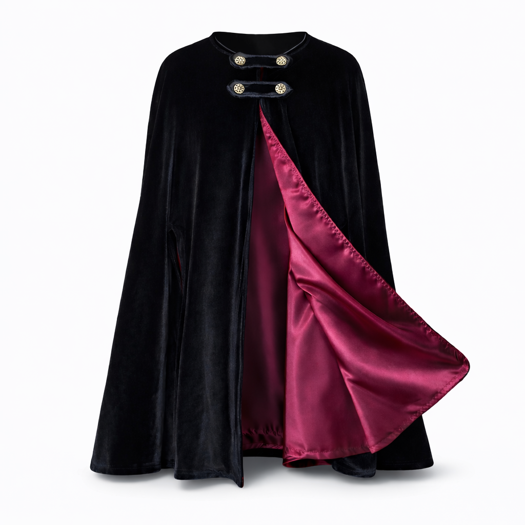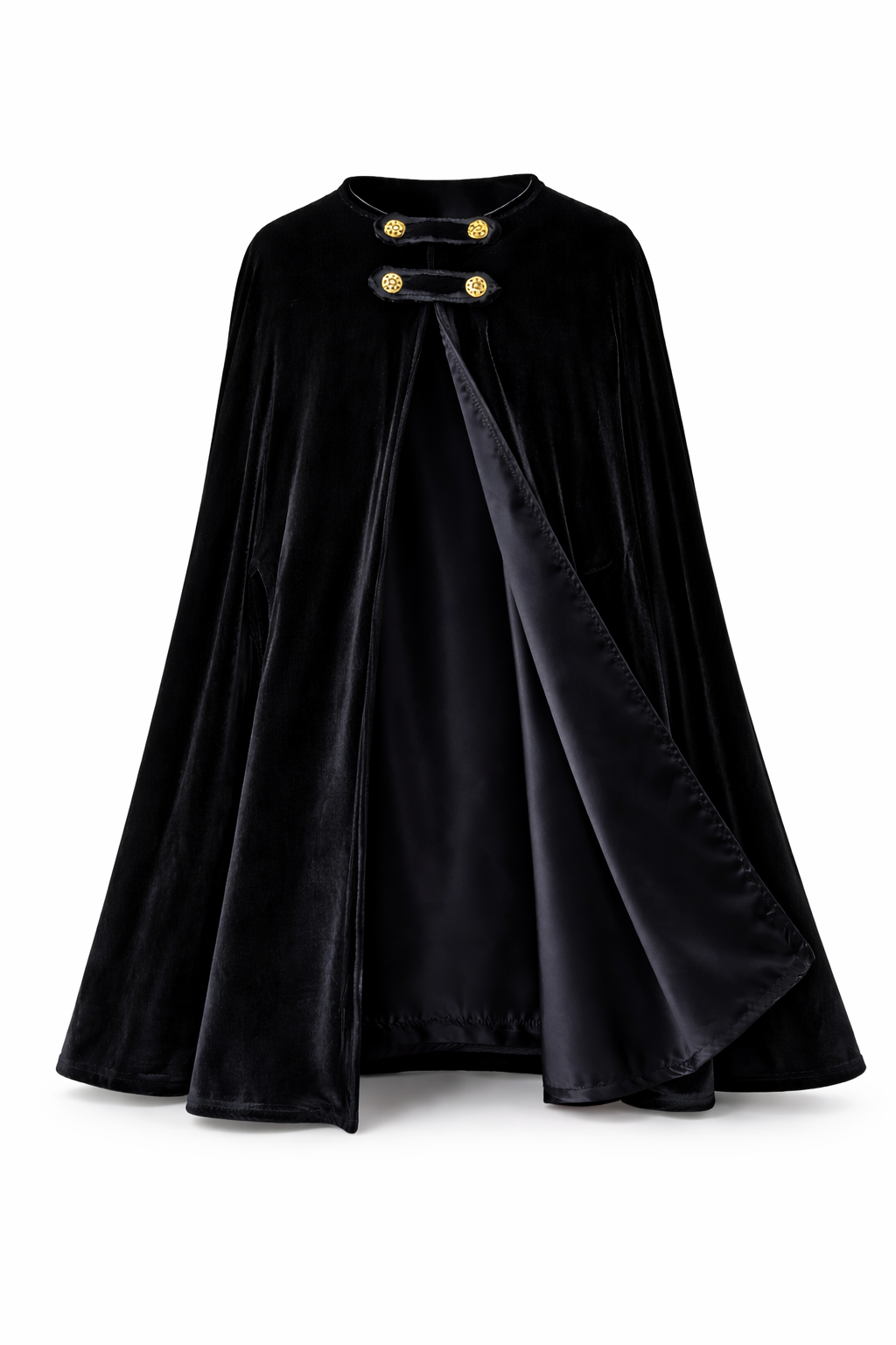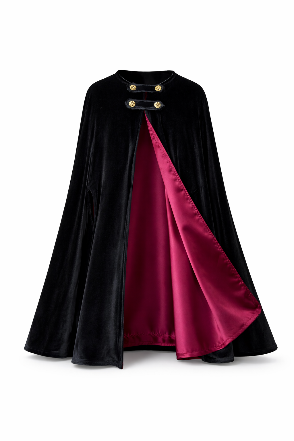 This medium-length, luxury cape is made from a premium-quality poly velvet material and entirely lined in a matching, remarkably smooth and glossy satin. It has a wide circular neckline, shaped shoulders, and an elegant front closure with two sets of gold-colored buttons. The design makes it easy to wear and versatile, sure to suit a variety of historic styles. Its voluminous folds, full length, elegance, and dramatic appearance lend its wearer an air of mystery. The cloak lining is fully attached along the front seams and at the bottom hem and neckline. The velvet is smooth (not crushed). The cape has two arm holes (or slits) for the hands to pass through; the lining is also fully attached along the seams. It is comfortable and stylish.