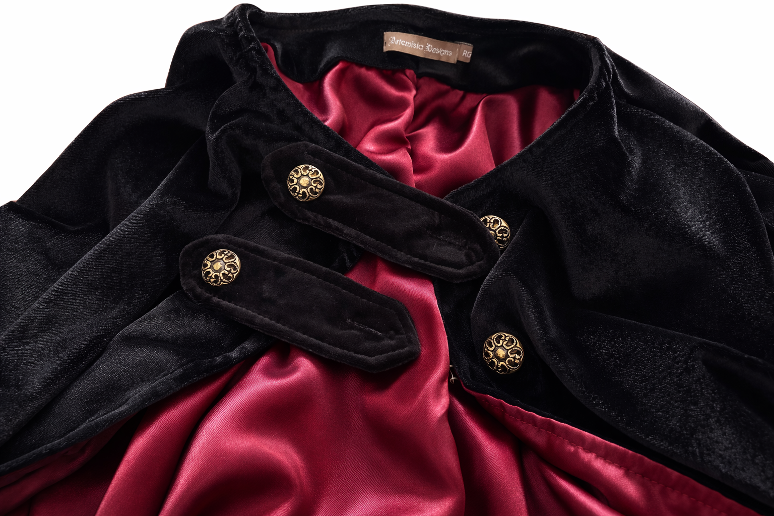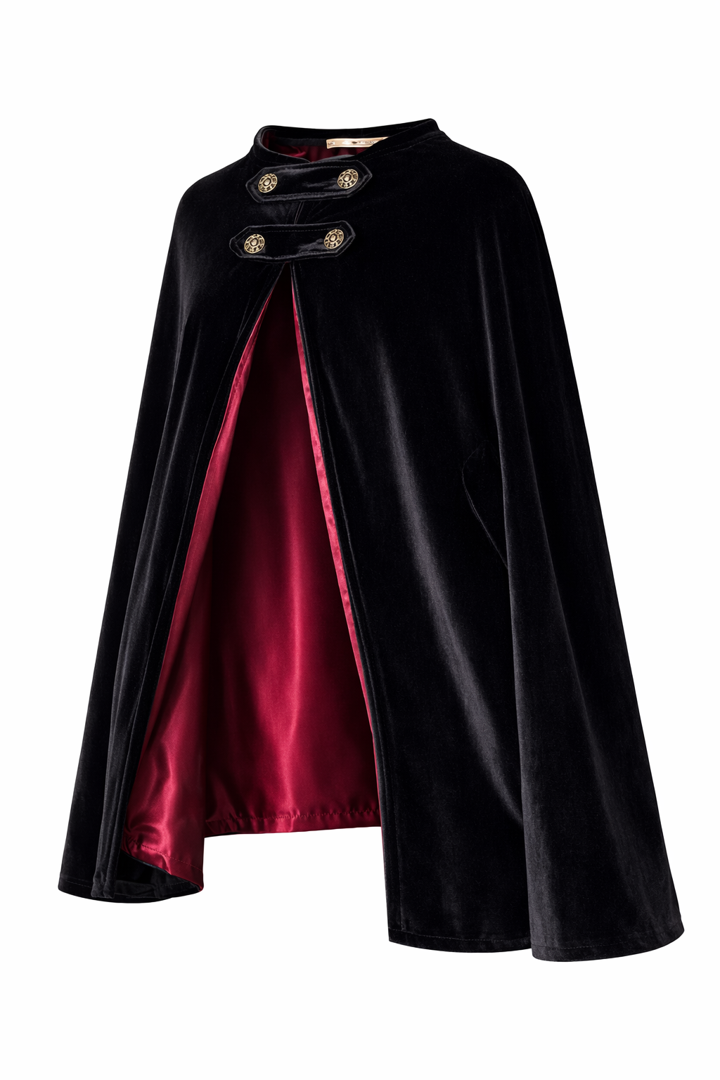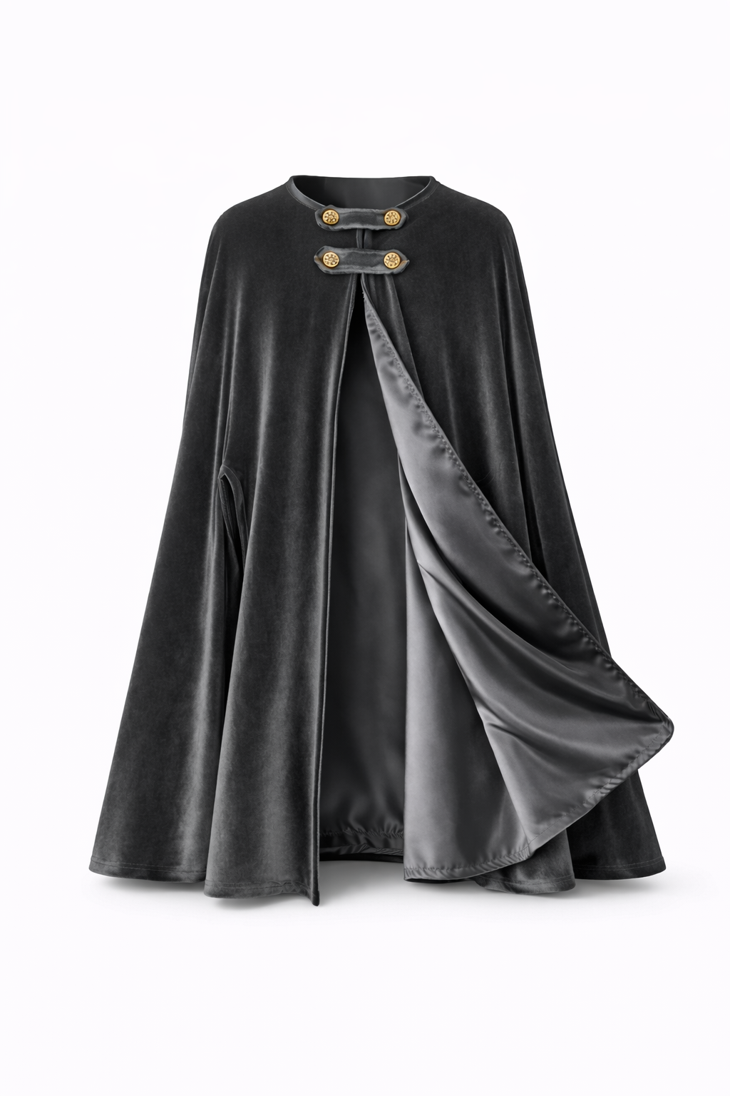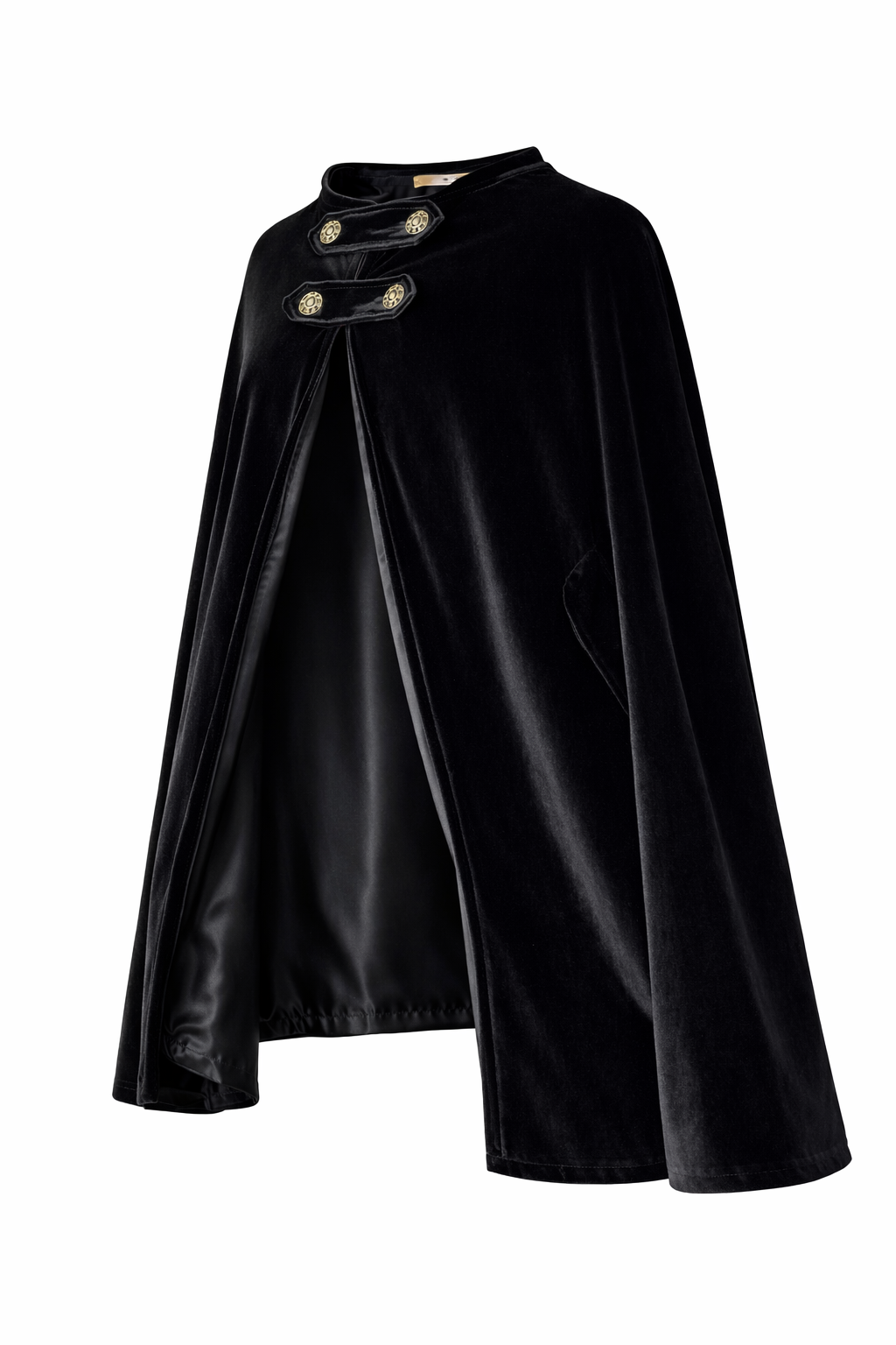 This medium-length, luxury cape is made from a premium-quality poly velvet material and entirely lined in a matching, remarkably smooth and glossy satin. It has a wide circular neckline, shaped shoulders, and an elegant front closure with two sets of gold-colored buttons. The design makes it easy to wear and versatile, sure to suit a variety of historic styles. Its voluminous folds, full length, elegance, and dramatic appearance lend its wearer an air of mystery. The cloak lining is fully attached along the front seams and at the bottom hem and neckline. The velvet is smooth (not crushed). The cape has two arm holes (or slits) for the hands to pass through; the lining is also fully attached along the seams. It is comfortable and stylish.