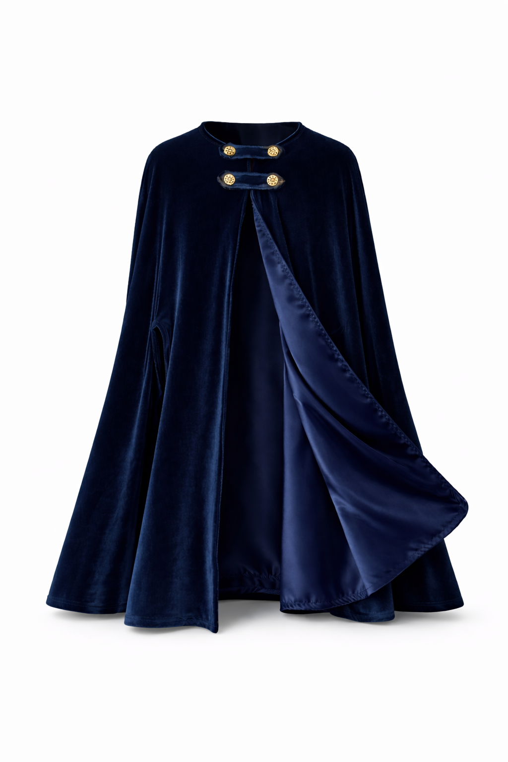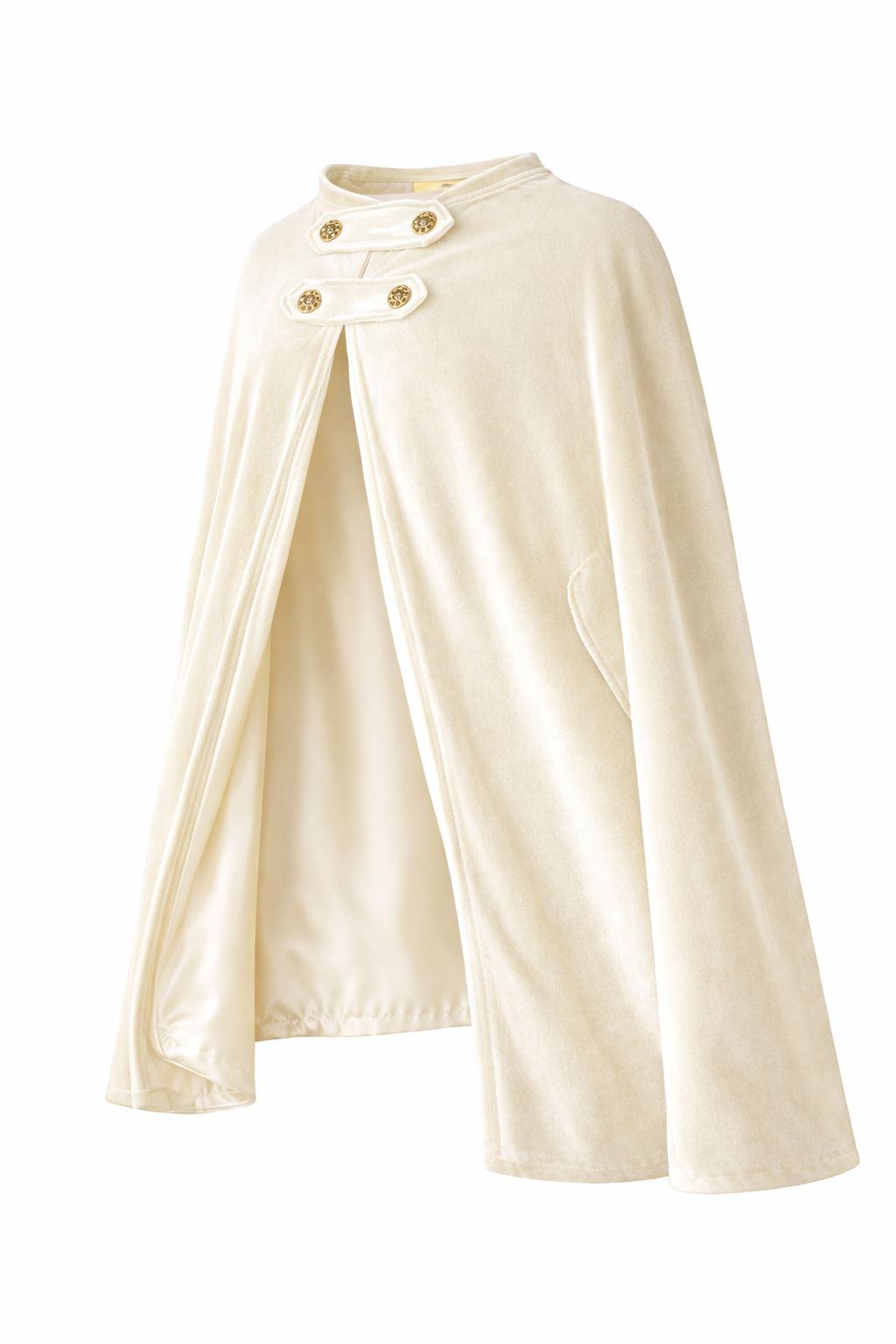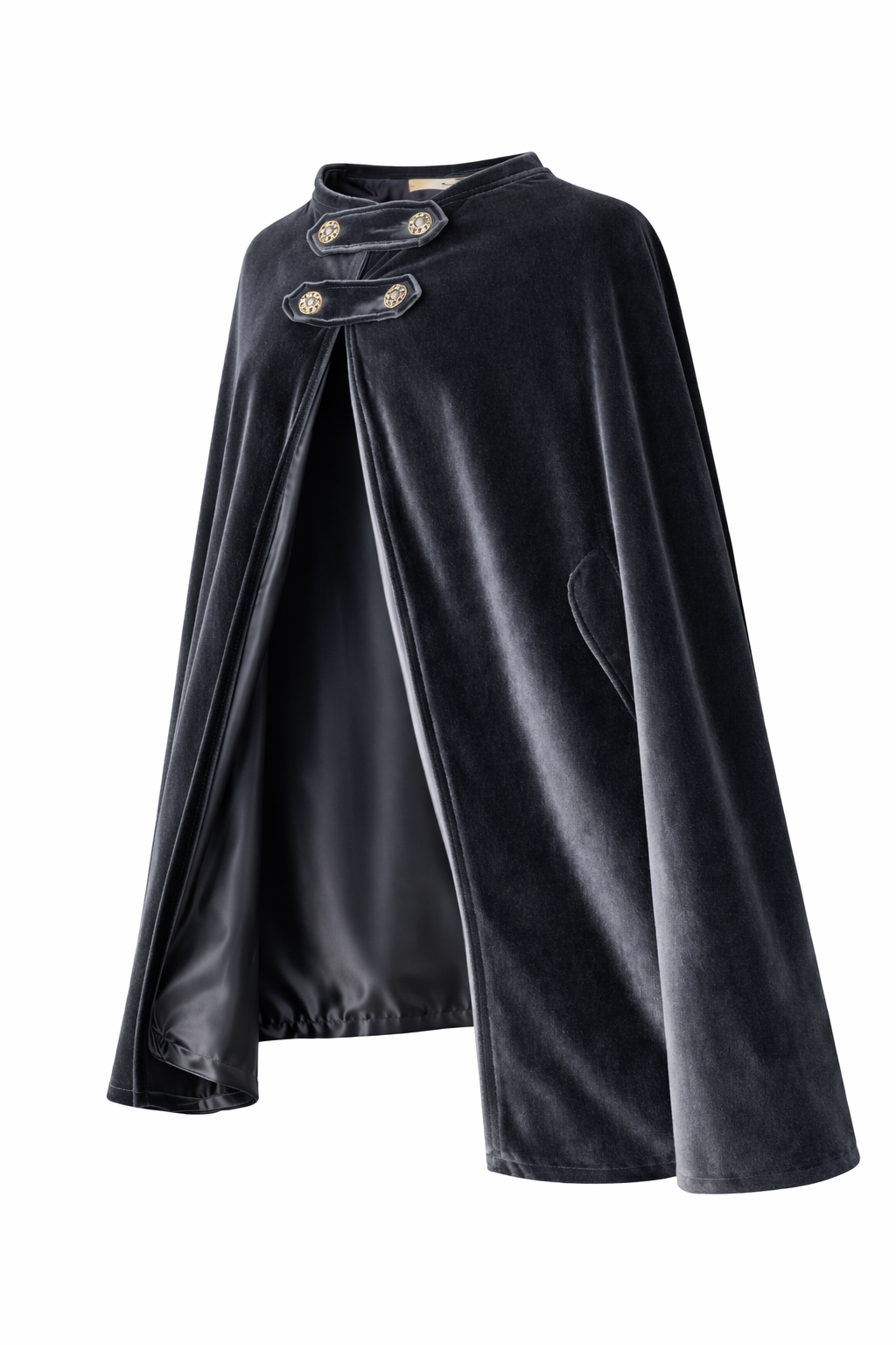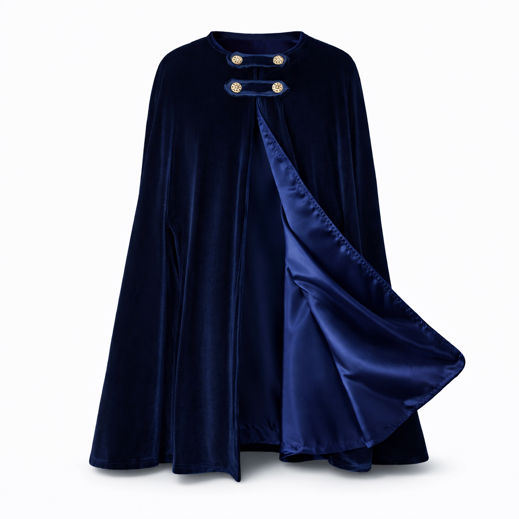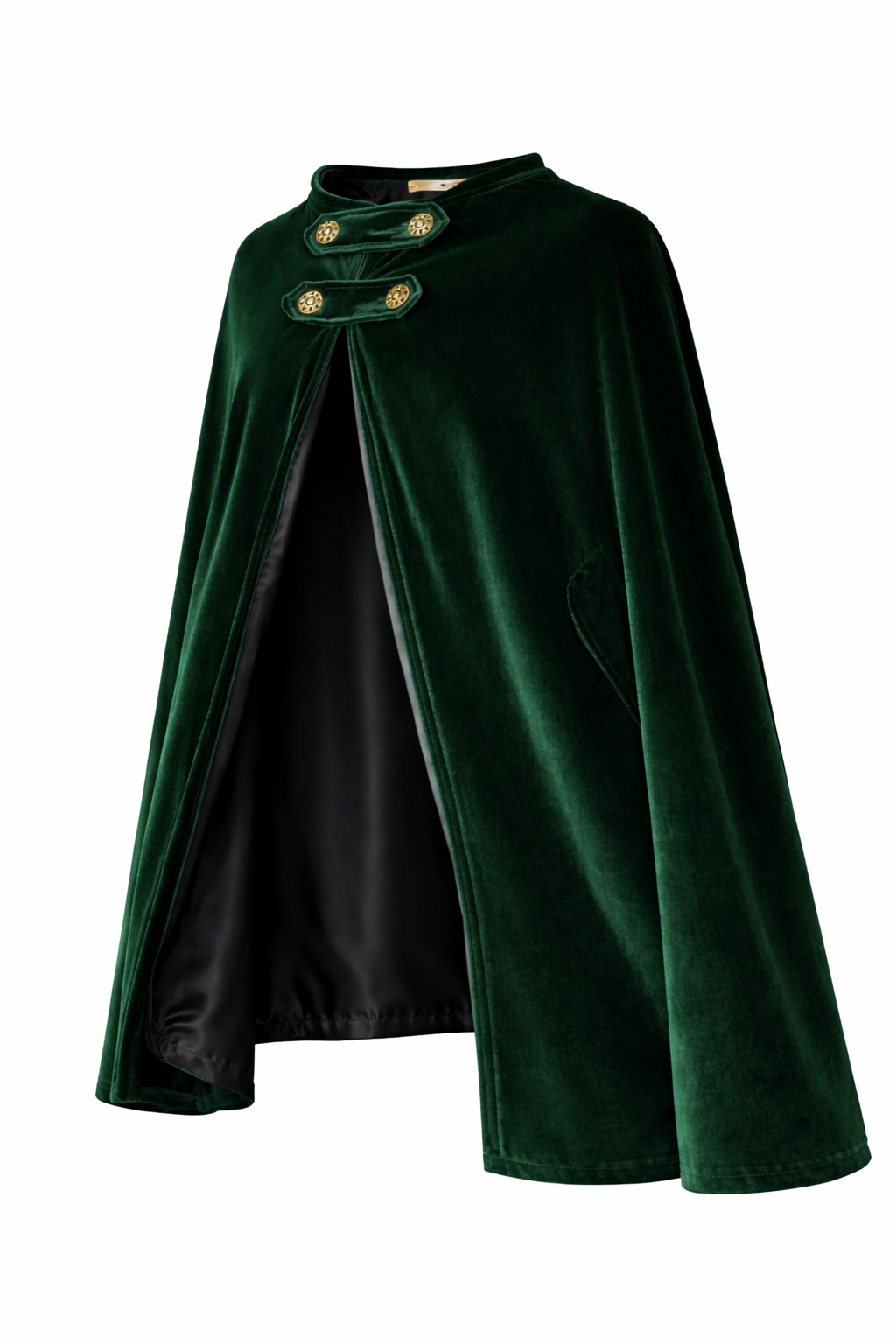 This medium-length, luxury cape is made from a premium-quality poly velvet material and entirely lined in a matching, remarkably smooth and glossy satin. It has a wide circular neckline, shaped shoulders, and an elegant front closure with two sets of gold-colored buttons. The design makes it easy to wear and versatile, sure to suit a variety of historic styles. Its voluminous folds, full length, elegance, and dramatic appearance lend its wearer an air of mystery. The cloak lining is fully attached along the front seams and at the bottom hem and neckline. The velvet is smooth (not crushed). The cape has two arm holes (or slits) for the hands to pass through; the lining is also fully attached along the seams. It is comfortable and stylish.