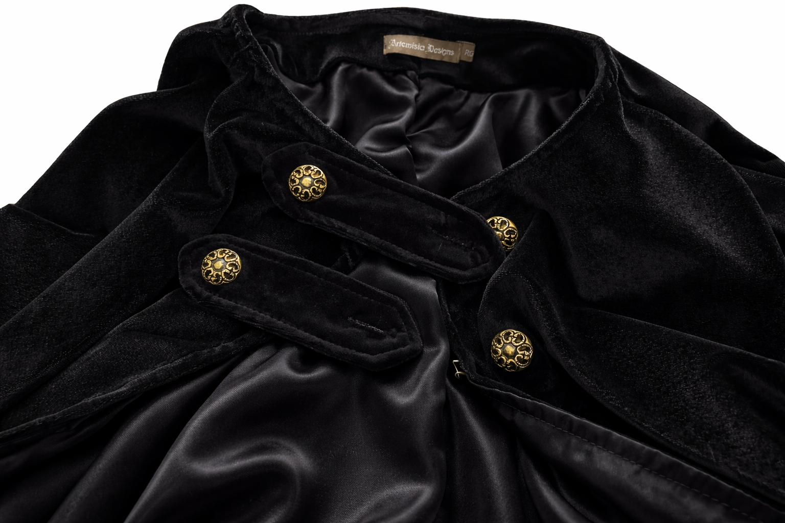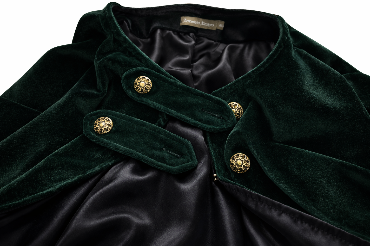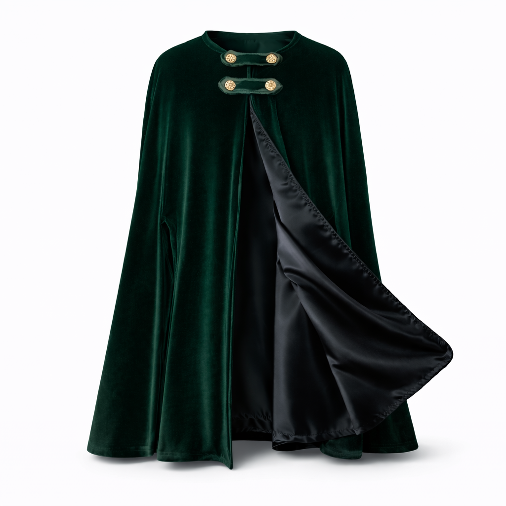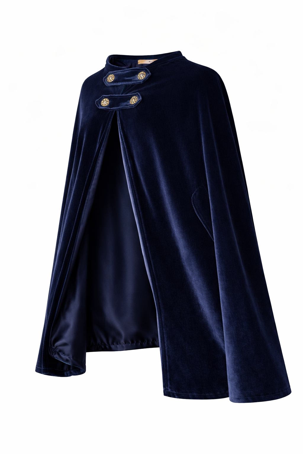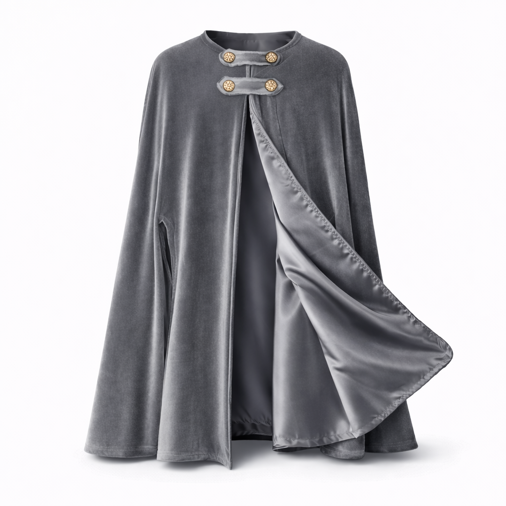 This medium-length, luxury cape is made from a premium-quality poly velvet material and entirely lined in a matching, remarkably smooth and glossy satin. It has a wide circular neckline, shaped shoulders, and an elegant front closure with two sets of gold-colored buttons. The design makes it easy to wear and versatile, sure to suit a variety of historic styles. Its voluminous folds, full length, elegance, and dramatic appearance lend its wearer an air of mystery. The cloak lining is fully attached along the front seams and at the bottom hem and neckline. The velvet is smooth (not crushed). The cape has two arm holes (or slits) for the hands to pass through; the lining is also fully attached along the seams. It is comfortable and stylish.
