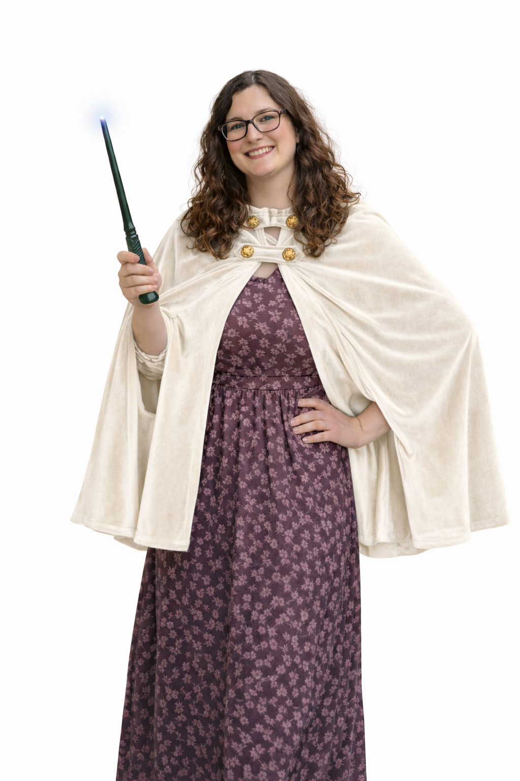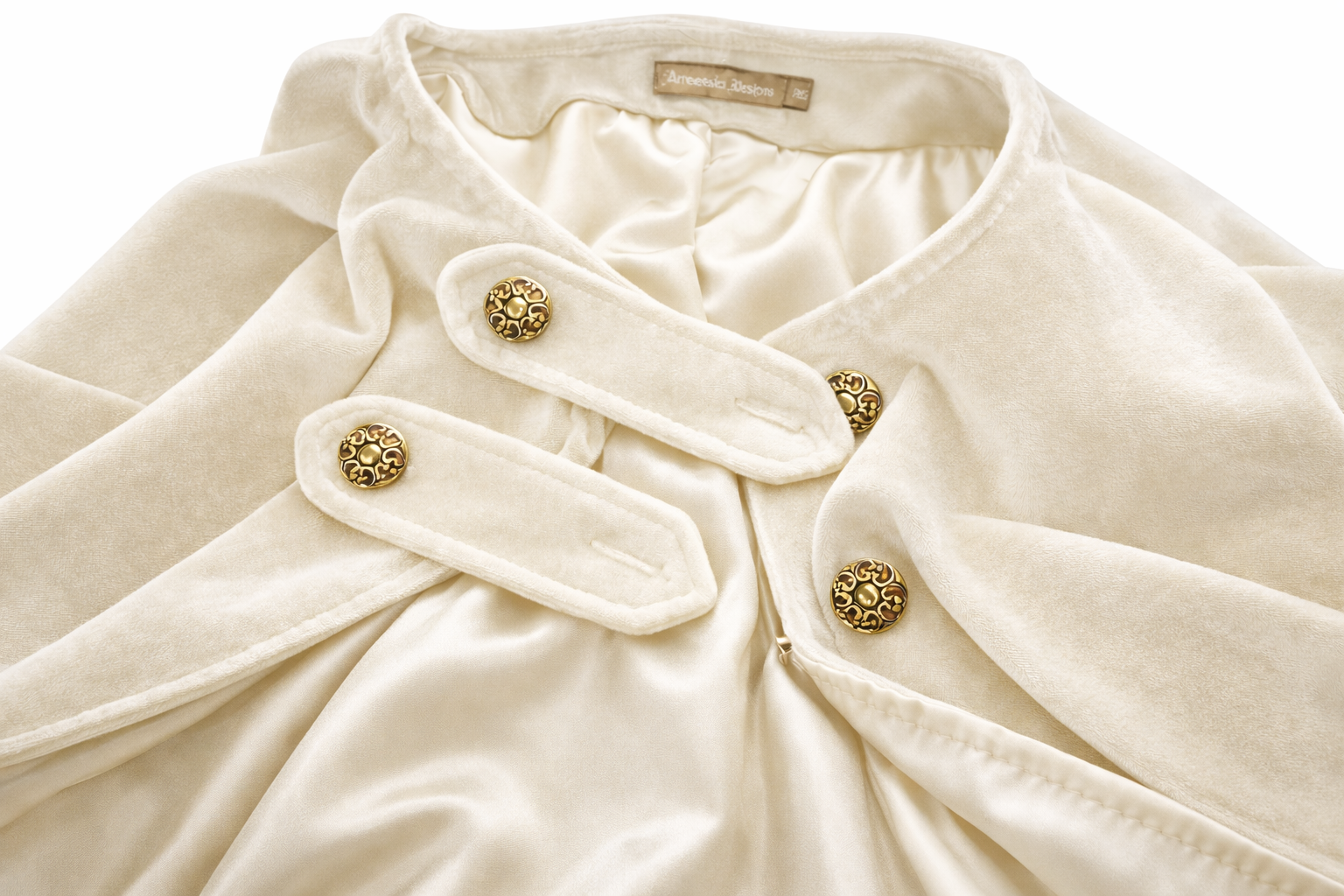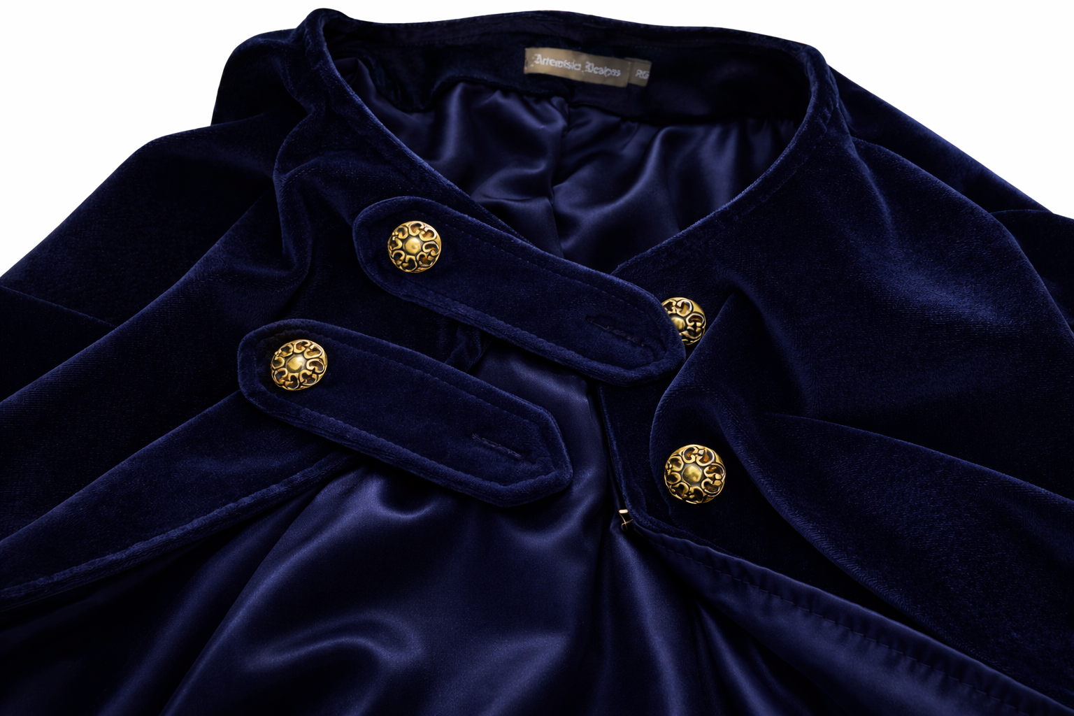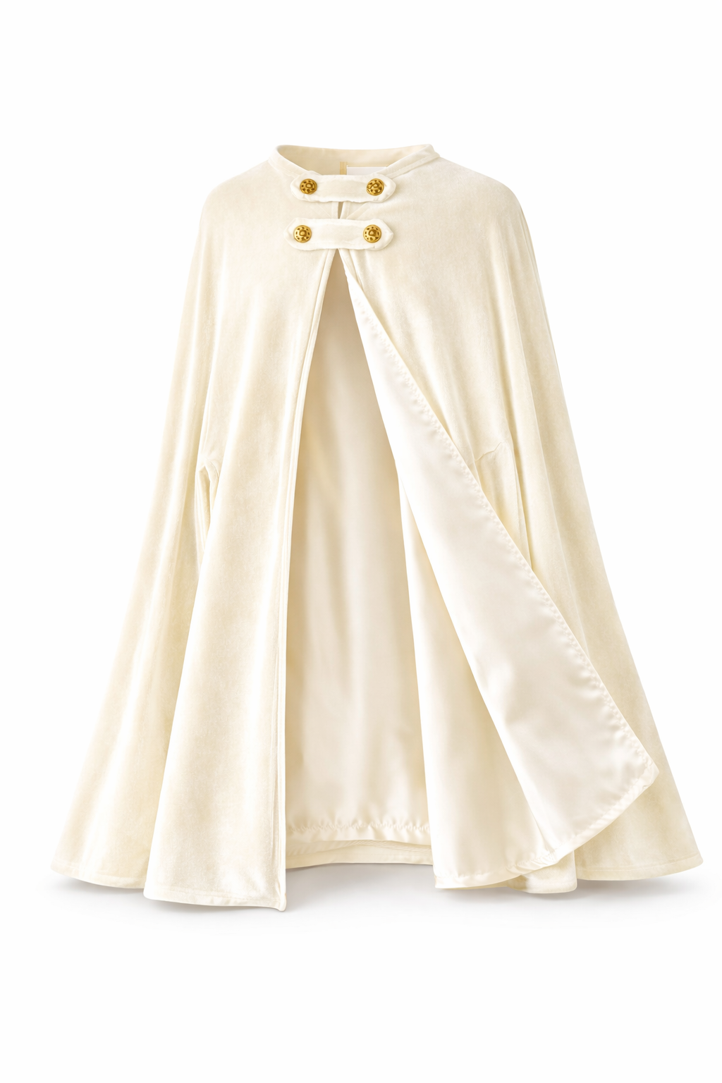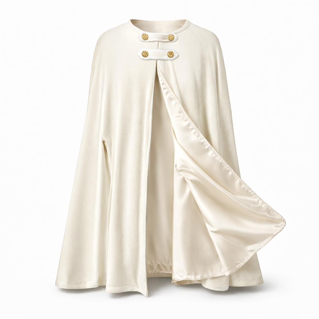 This medium-length, luxury cape is made from a premium-quality poly velvet material and entirely lined in a matching, remarkably smooth and glossy satin. It has a wide circular neckline, shaped shoulders, and an elegant front closure with two sets of gold-colored buttons. The design makes it easy to wear and versatile, sure to suit a variety of historic styles. Its voluminous folds, full length, elegance, and dramatic appearance lend its wearer an air of mystery. The cloak lining is fully attached along the front seams and at the bottom hem and neckline. The velvet is smooth (not crushed). The cape has two arm holes (or slits) for the hands to pass through; the lining is also fully attached along the seams. It is comfortable and stylish.